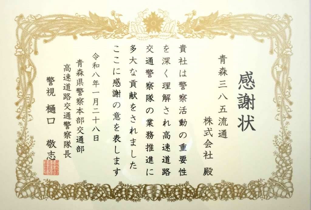 1月28日、青森三八五流通㈱・八戸炭酸カルシウム工業㈱・三八五自動車整備工業㈱は、高速道路交通警察隊の業務推進に貢献した功績により感謝状を受けました。